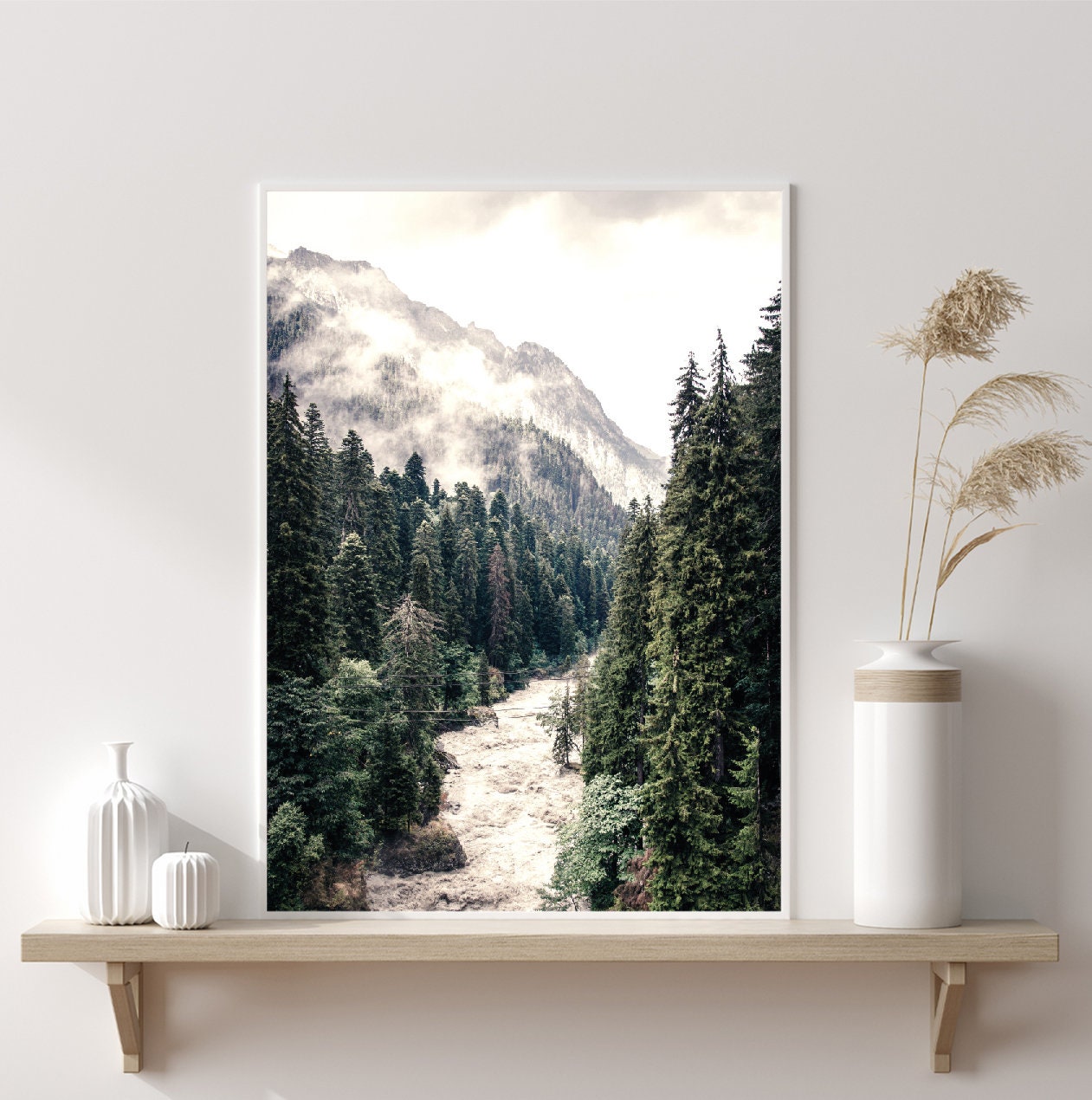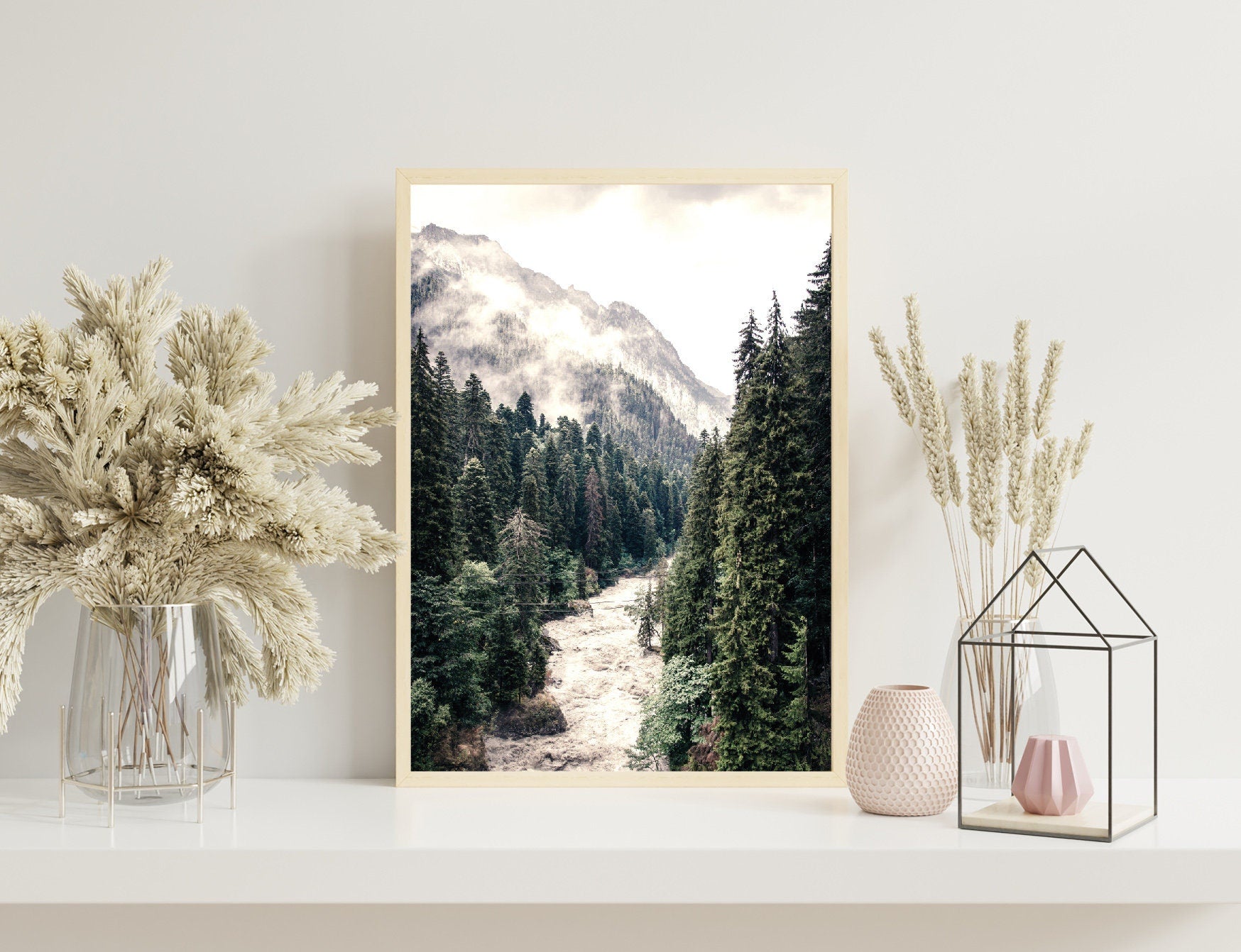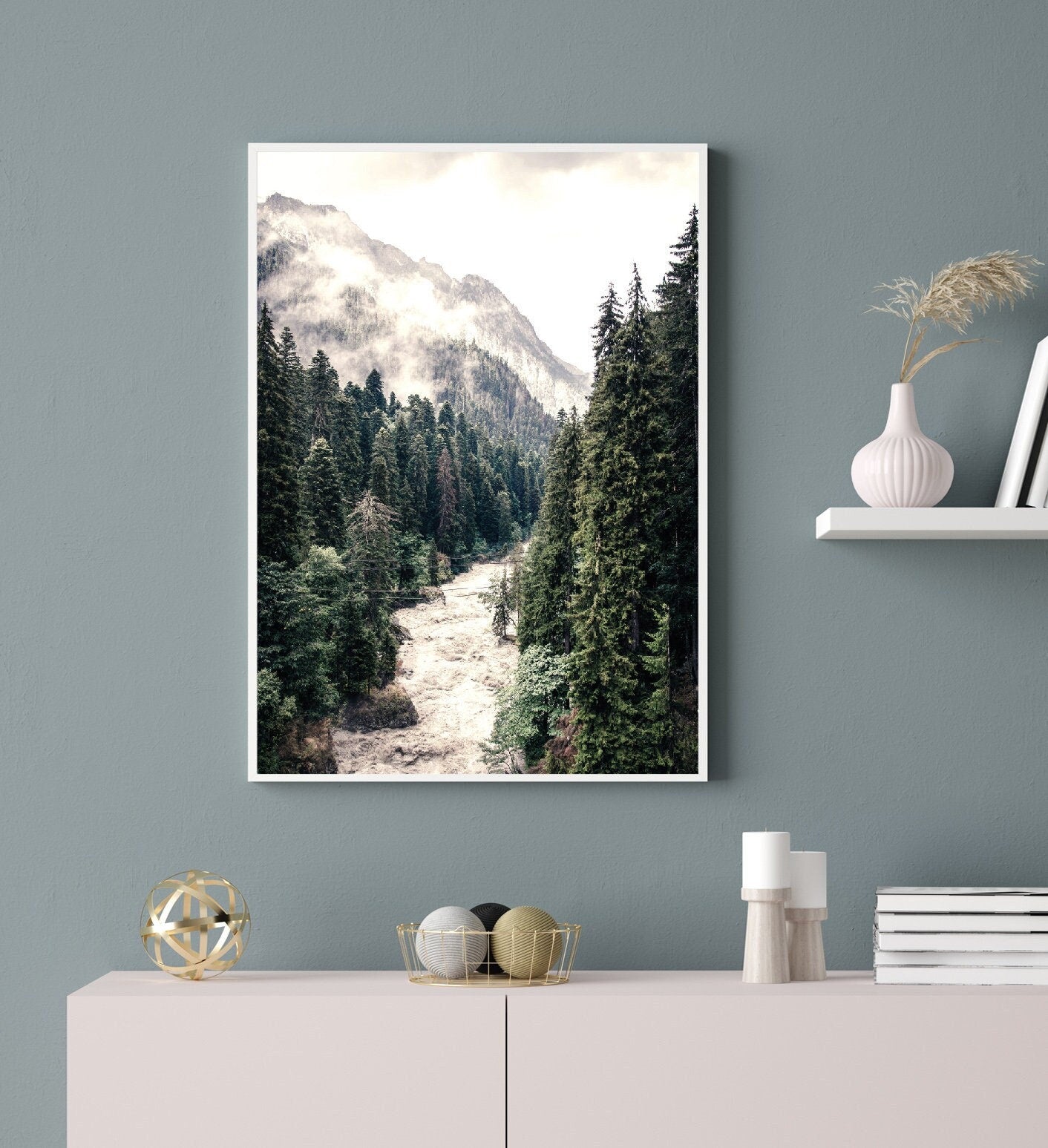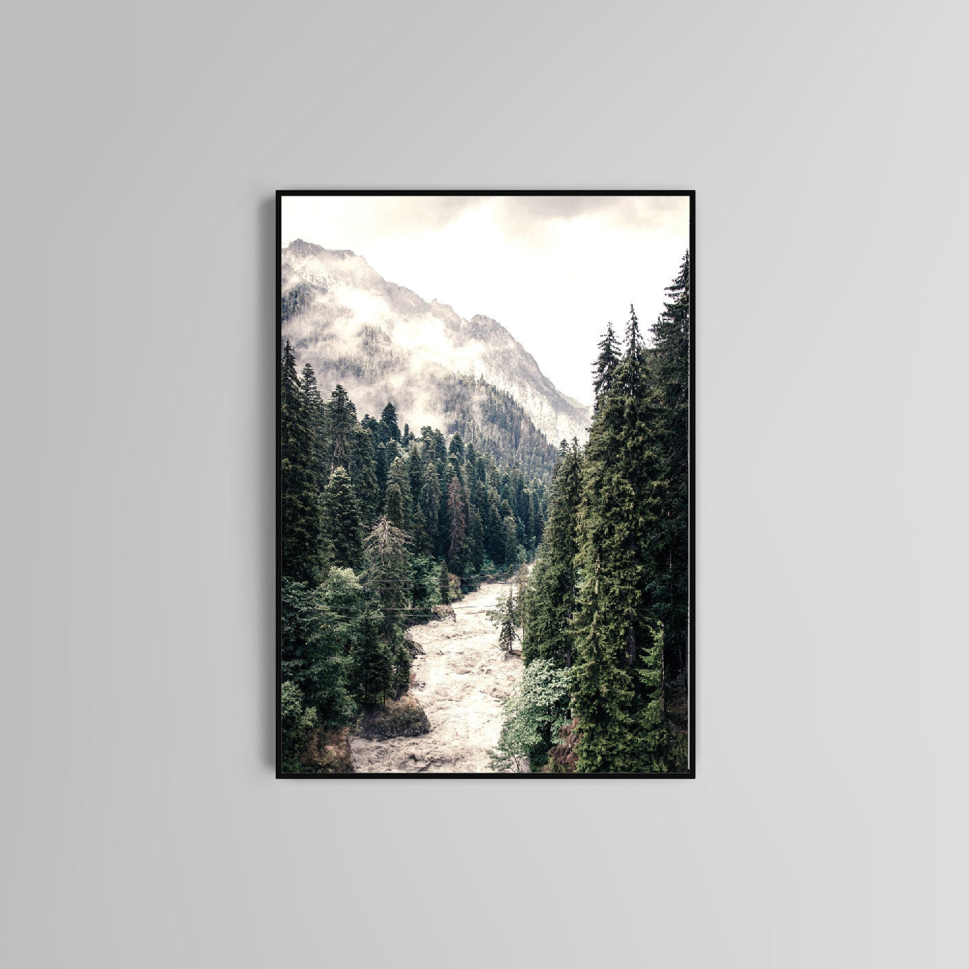 River in Forest Print has a tranquil and calming effect, perfect for any room in your home. The muted colours will style up any living space and the print is the perfect addition to your home décor collection or as a gift for a friend. With mountains in the background, this print will remind you of nature's serenity and bring peace to your day.